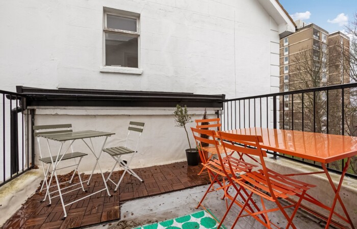 Upon leaving the second bedroom, a further flight of stairs leads to the next half landing where you will find the reception room, kitchen and main bathroom as well as access, via the window, onto the roof terrace. There is also a further useful storage cupboard.