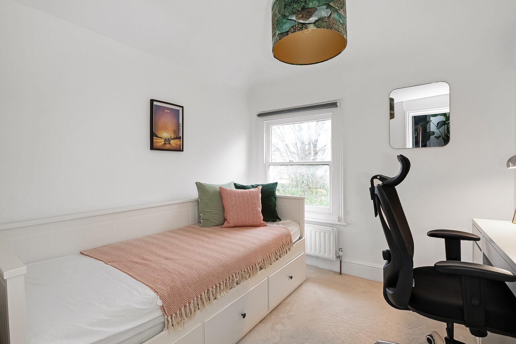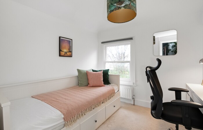Upon entering the apartment a flight of stairs leads to a half landing with some built-in storage and access to the second bedroom. The second bedroom is a cosy room, which would make an excellent child’s or guest bedroom and/or a separate home office. It has a sash window looking down onto the rear of the property.