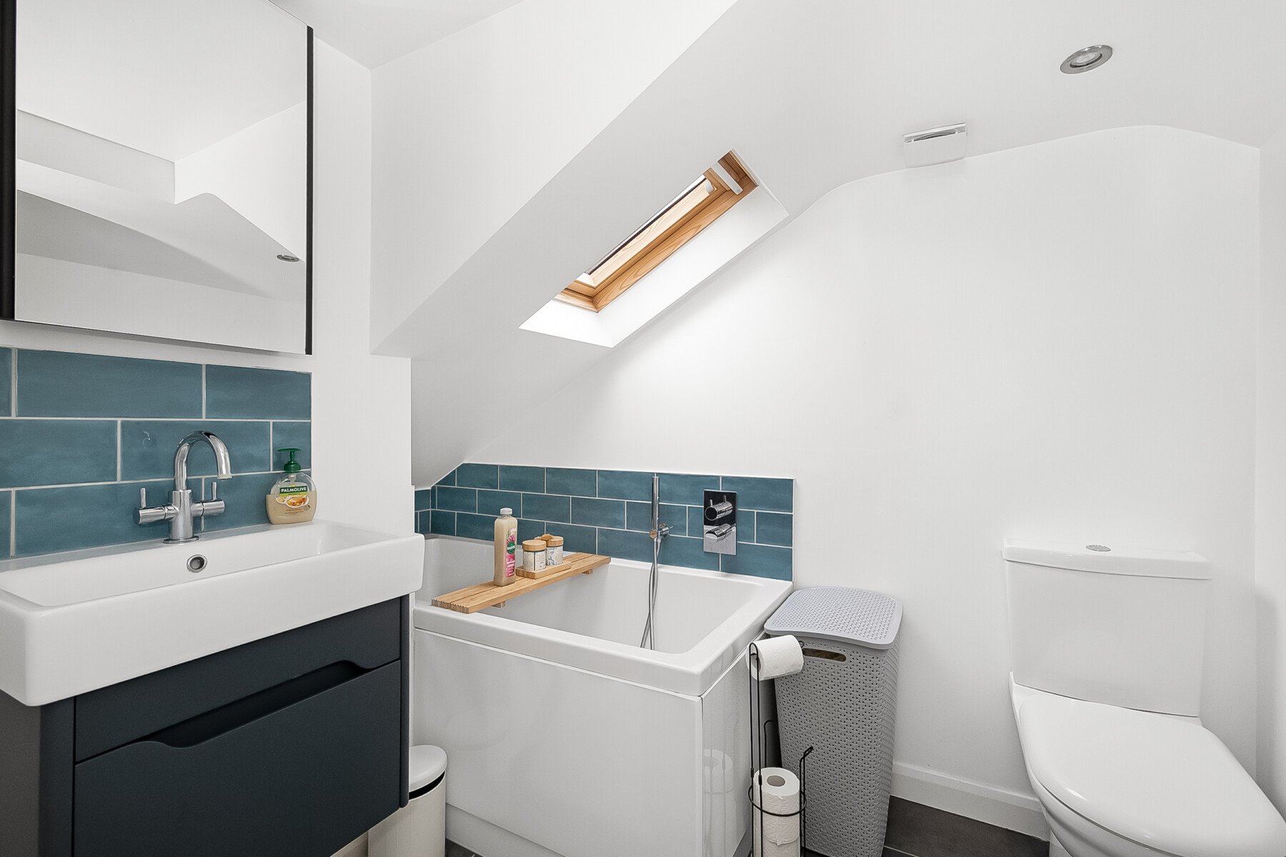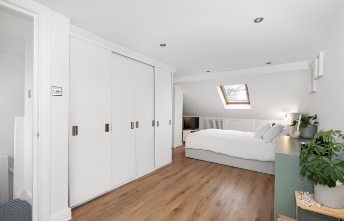 From the landing the staircase leads up to the master bedroom suite. The master bedroom is a very spacious double room with a Velux roof window to the front and triple fully glazed windows opening onto a Juliet balcony at the rear with views down onto surrounding gardens. The bedroom benefits from a range of fitted storage as well as under eaves storage. Ensuite to the master bedroom is a bathroom fitted with a bath, white handbasin and white WC. There is also a modern heated towel rail.