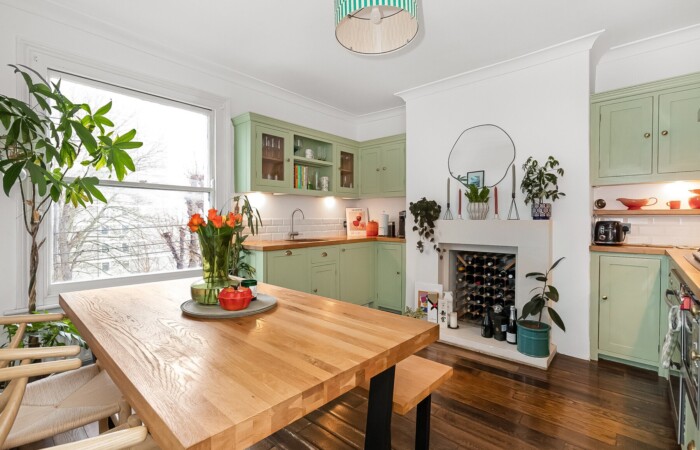 Next to the reception room is the pretty kitchen diner, which has a large sash window looking down onto the central green spaces of Rye Hill Park. The kitchen is fitted with a range of painted shaker style units with a solid wooden worksurface. There is an integrated hob, double oven, microwave, fridge, freezer and slimline dishwasher. The floor is again stripped and stained wooden floorboards and there is ample space for a dining table and chairs.